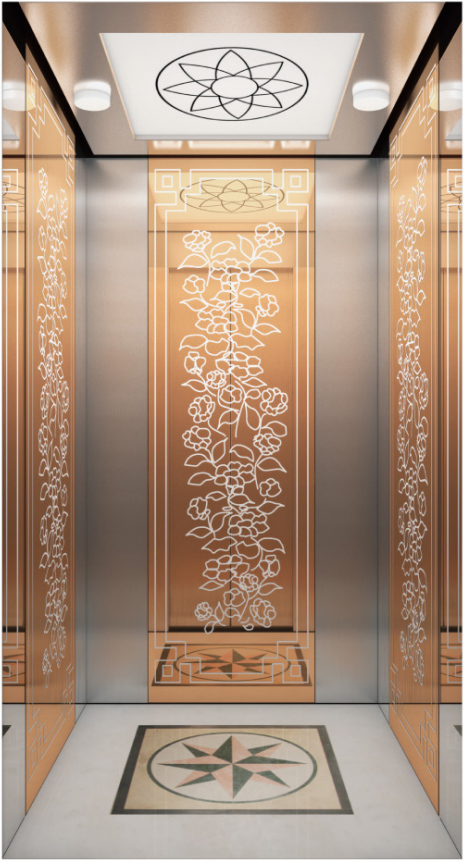 轎壁:三壁玫瑰金鏡面蝕刻不銹鋼,前壁發(fā)紋不銹鋼,輔助板發(fā)紋不銹鋼